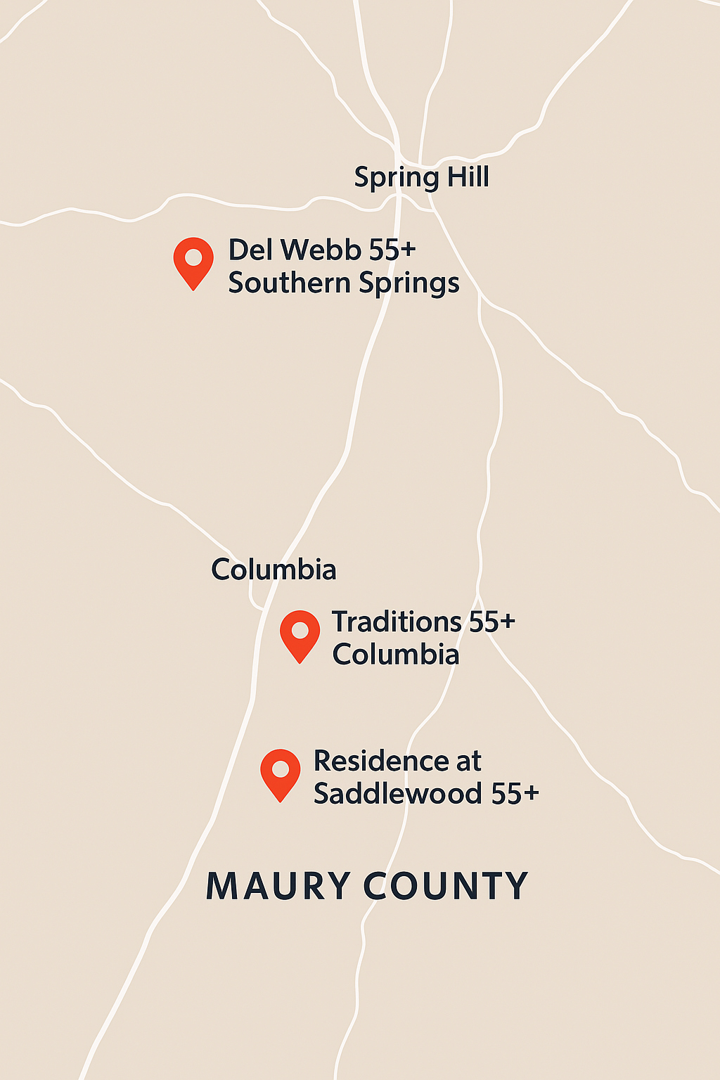 If you’re thinking outside the Williamson County box, you may want to consider Maury County, which has Spring Hill and Columbia. There are a few 55+ options there, such as Del Webb in Spring Hill.
