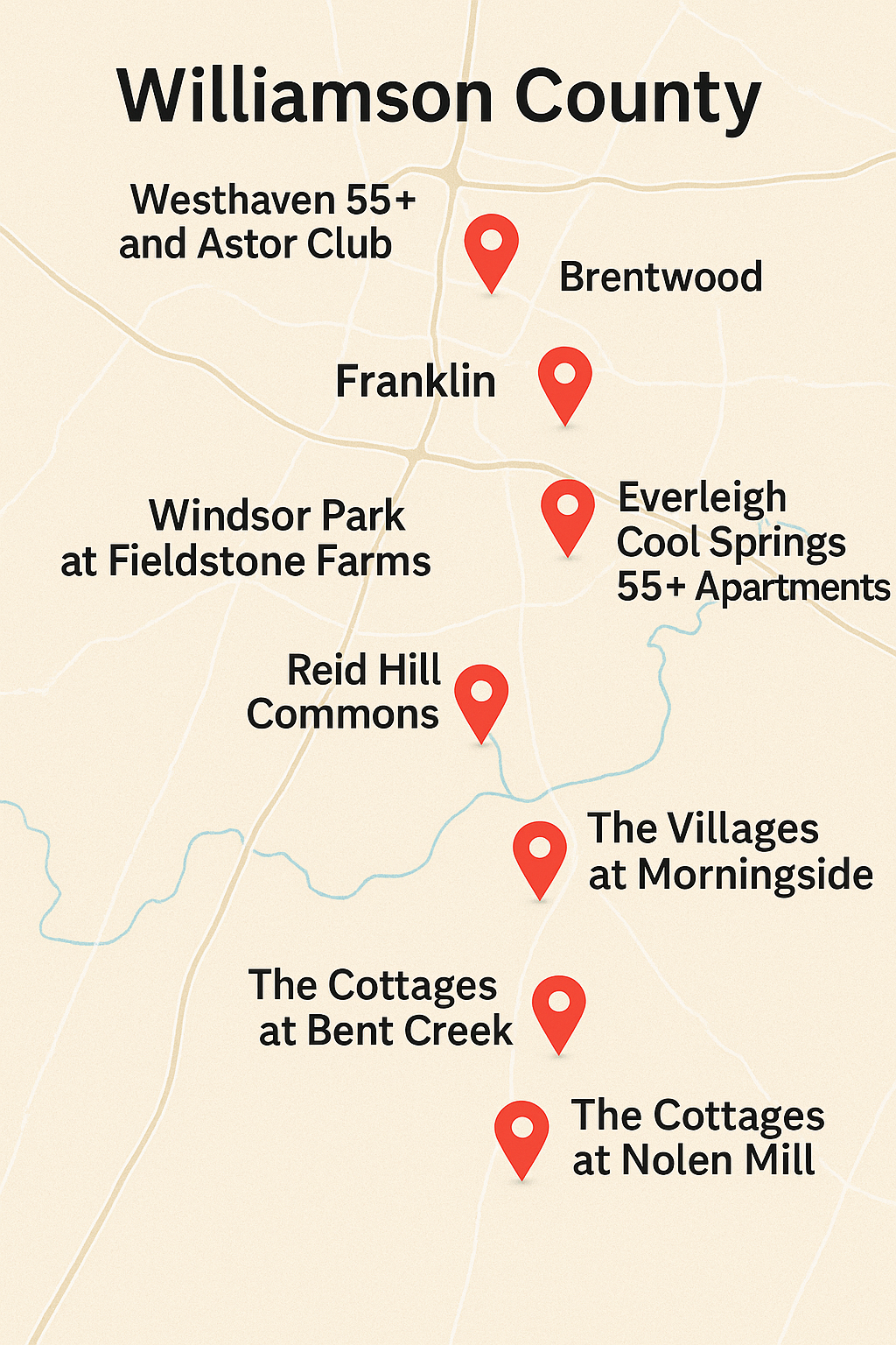 Here is a quick, non-exhaustive list of 55+ and senior living options in Williamson County to research and tour: